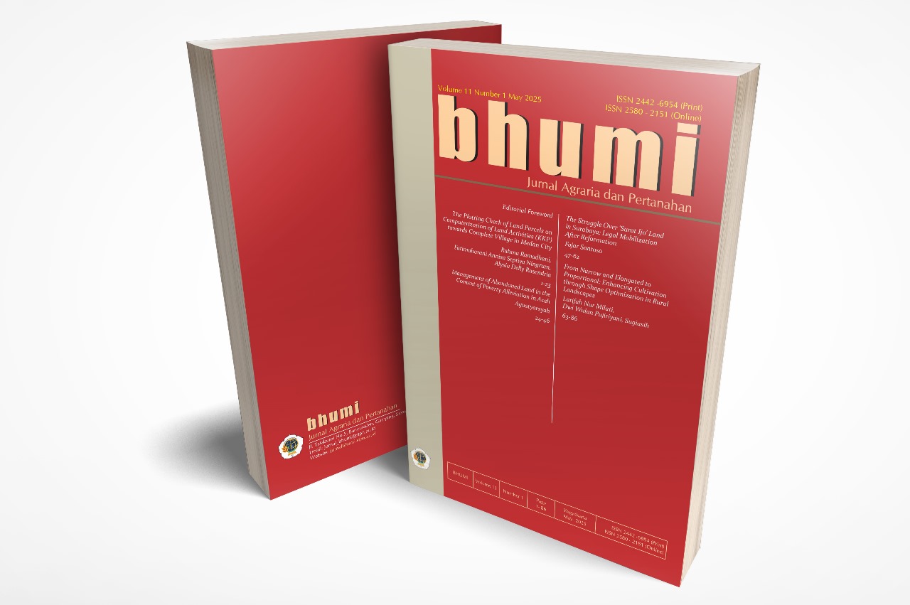 Abstract: This research aims to examine the transformation of narrow, elongated land in Triharjo Village into a more proportional shape through agricultural land consolidation activities. In the 1990s, the community self-organized, leading to a mismatch between the physical and legal conditions of the land. The government's initiative to accelerate systematic land registration through the Land Management and Policy Development Program in 2006-2007 also proved unable to accommodate this issue. The research method used is a qualitative approach with a case study. Data was collected through observation, document study, and in-depth interviews. Data analysis was conducted using the Miles and Huberman analysis method with 3 stages: data reduction, data presentation, and conclusion drawing. The research results show that the majority of agricultural land in Triharjo is less than 200 m² in size, with an unfavorable length-to-width ratio for cultivation. This condition stems from past inheritance processes that adhere to the principle of justice and the saying 'kabeh mangku dalan.' The implementation of the agricultural land consolidation program in 2019-2020 was able to achieve consistency between physical and legal conditions, provide proportional land parcel shapes for cultivation, and supply agricultural support infrastructure in the form of farm roads and irrigation channels.